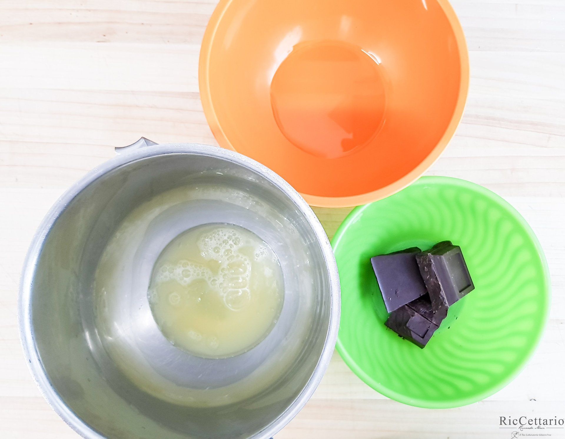 Portare a bollore il latte di riso, nel frattempo sbattere le uova con zucchero fino a una lieve montatura, aggiungere l'amido ben setacciato e amalgamare il tutto, versare nel latte bollente e cuocere fino al raggiungimento massimo di 82°C mescolando di tanto in tanto.